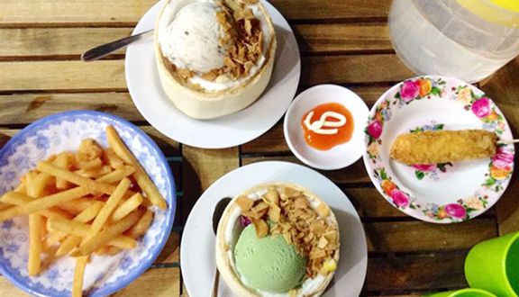 Chồng mình khó ăn uống nhưng khen kem dừa ở đây ngon, lần nào tới ăn cũng phải kêu kem dừa hết ấy. Thấy quán lúc nào cũng đông khách hết, bên cạnh bán kem xôi dừa quán còn bán cá viên chiên,bingsu, kem,trái cây tô.